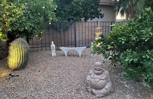 Consider this 500 SF detached casita (bungalow) on it’s own private lot with beautiful outdoor space & even a Zen garden your home away from home while you visit Green Valley. This adorable property features a studio set-up with a fully-equipped kitchenette, utility room with full size fridge, comfy queen-sized Murphy bed, perfect for a cozy night's sleep or a semi- permanent home! The fabulous bathroom offers a custom-tiled shower, and there's even an additional space with a comfortable sofa in the living room. With amenities like a separate utility room for storage & full-size fridge, TV with all streaming services, WiFi, heating, a hair dryer, a stacked washing/ dryer machine, AC, and an iron, all appliances & utensils, outside has fireplace & barbecue, you'll have everything you need for a delightful stay. It's easy to see why you'll be able to unwind at our place.