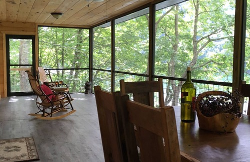 Newly constructed, beautiful 2 bedroom 2 bathroom cabin that sleeps 6. Sip your favorite beverage watching the sunset over the mountain range. Right on the waters edge, bring your own boat, kayak, or canoe to use on the personal dock! Perfect for fishing, swimming and boating. Includes washer and dryer, new appliances, landline telephone, queen sized beds, full/double sized futon. Large screened in porch, with hammock hooks, overlooking Lake Nantahala. Outdoor fire-pit, deck and picnic area on site. Big Choga boat ramp is conveniently located nearby. Our handcrafted furniture and decor welcomes you to the cozy Appalachian setting. Now offering Starlink Internet/Wifi