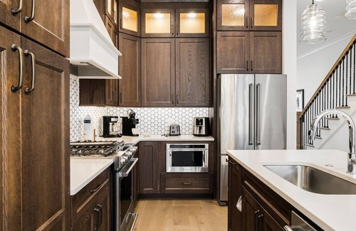 Nestled on the third level of this exquisitely crafted townhome are two impeccably designed bedroom suites, with comfortable beds selected for guest experience in mind - you'll never want to leave! The primary suite, located at the rear of the home, features a king-size bed, flat-screen TV, and a luxurious, spa-inspired ensuite bathroom with a double quartz vanity and an expansive walk-in shower. Between the two suites, a full-size front load washer and dryer offers the convenience of in-home laundry. The second suite, situated at the front of the home, is both charming and cozy, with a queen-size bed, generous closet space, and a private ensuite bath with a tub-shower combo — ideal for guests of all ages.