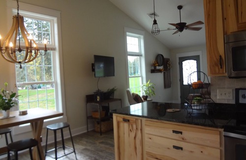 This beautiful home.. FULLY FURNISHED, all on one level, very private, clean and well cared for. This guest home.. has no close neighbors, has high Cathedral ceilings and has special pricing for an extended stay. WE ARE NOW OFFERING AN EVEN BETTER RATE FOR A THREE OR FOUR MONTH STAY. STARTING IN DECEMBER AND THROUGH APRIL. PLEASE ASK FOR DETAILS. WE CAN DO A GREAT MONTHLY RATE WITH EVERYTHING INCLUDED. Smart TV, Cable, High Speed internet, WiFi, all utilities including heating. water/sewer.. FULLY FURNISHED. Charlie and I are committed to having the home very clean, and sanitized between guest visits. We want our guests to enjoy comfort and peace of mind. The home has everything you would need for a get away or just some quiet family time away from the hectic world. This is a great spot for a professional couple or suitable for a small family that would like to stay for two weeks or longer. It's also close to PSU and MT NITTANY MEDICAL CENTER. If you're wanting to buy a home in the State College area.. this might be a great place to stay while you're looking. YOU CAN STAY FOR TWO WEEKS OR LONGER. The home has tile flooring throughout . The tile flooring is a wood grain planks. Heated flooring in bathroom. Carpeted bedrooms. All new stainless appliances, granite counters in kitchen and baths..High Cathedral ceilings, open floor plan, lots of closets, 2 full baths, 3 bedrooms. One is perfect for an office. New Front load washer and dryer in unit. Large deck overlooks the beautiful Spring Creek #1 Trout Stream in PA. Property is very Private with no one close by, it has a beautiful setting. The large heated pool is open May through September and is a private pool for the guests use. The private hot tub is wonderful and is open year round. We commonly see Bald Eagles visit the creek and nest close by. No close neighbors and plenty of off street parking for two to three cars. Electric Heat pump and Central Air-conditining is in the home.. Beautiful big energy efficient windows that provide lots of great lighting and beautiful views. It has a great fire pit with lots of wood for a cozy fire and a perfect spot to roast some marshmallows The hot tub seats 5 to 6 with a very nice water fall and colored lighting. Lots of jets to help sooth tired muscles. It's a perfect location to State College.. only a couple minutes to down town, center. The home is only a couple miles to PSU STADIUM and MT. NITTANY MEDICAL CENTER. It has Great walking trails within a mile of the home, a nature preserve close by.. a large meadow and Spring Creek in the bark yard, Spring Creek Park is close by, close to all that State College offers. Although the home can easily accommodate 6 people with the 3 bedrooms.. for short stays.. If your wanting to stay an extended time you might prefer a smaller group. For extended stays 2 to 4 people works very well. Home is very clean, well sanitized, and provides all that you would need except your food.