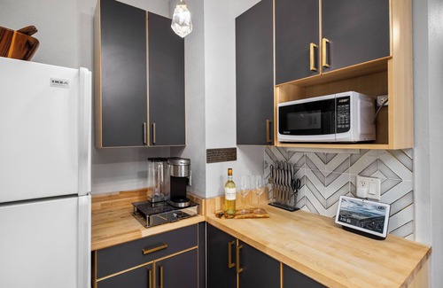 Experience luxury and convenience at this stylish, centrally-located open concept guest house. Enter through a private Zen garden with a tranquil water feature, leading to a modern space with mid-century flair. Features include a glass slider wall for an indoor-outdoor experience, a private spa-like bathroom with an LED mirror, stainless towel warmer, and Bluetooth speaker. The suite offers a glass and acrylic dining table, butcher block counters, Google Nest Hub smart home display, a low-profile king bed, convertible sleeper sofa, and a suspended pod chair.