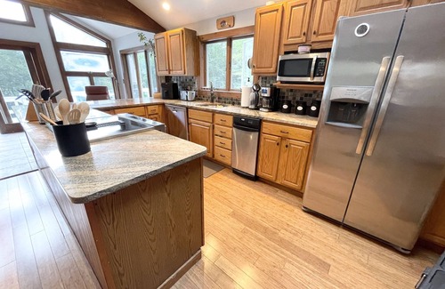 Great Room ~ Living room with 55’ TV, wood burning stove, dining area, and fully equipped kitchen