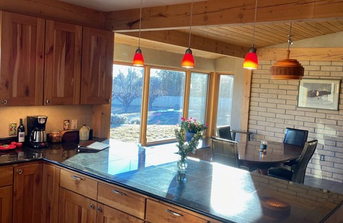 The house is a nineteen hundred square foot eco friendly home with in-floor heating, passive solar, lots of windows, natural and non-toxic finishes. The design is a one level open floor plan with high ceilings and skylights that allow for natural light. The kitchen, dining, living, and nooks all open to each other. There is in floor heating and a wood stove which is available, but not necessary, for your use. The floors are concrete with area rugs. Enjoy a beautiful sound system with speakers throughout the house and outside with controllable zones, capable of connecting to your own music through Bluetooth. There is no TV service however we do provide Netflix, Disney+, and HULU. We do have Internet. Appliances are well appointed and include a large washer and dryer. The master suite has a queen size bed with private bathroom. The second bedroom has a queen size bed and adjacent full bathroom. Both have down comforters and cozy bedding. With a futon style single mattress in a bump out in the back of the house, and a futon couch, 6 people can sleep comfortably. There are also 2 cots available and a blow up mattress, which allows for 3 additional makeshift beds. The house sits at the top of the property and has large picture windows in a sun bump out with spectacular views overlooking the orchard. There is an outdoor grill and outdoor dining area.