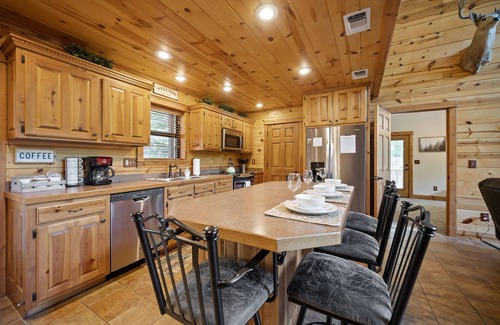 Inside you can rest easy with a kitchen supplying all your necessary small appliances/cookware as well as a Keurig and drip coffee maker (starter supply of coffee pods, grounds and filters provided for your convenience). Additionally, the cabin offers a washer and dryer, recliner sofas, a 65-inch Roku Smart TV (bring your own Netflix/Hulu passwords), and if you’re feeling up to the challenge, a foosball table in the loft!