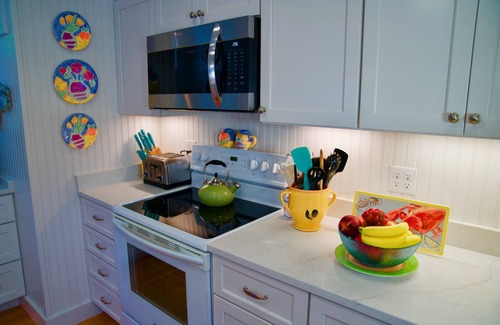 We are pleased and excited to share with you that we have completed the renovation of an additional second bathroom with laundry and an updated kitchen expansion to our beloved Cottage on the Pond. At the same time we have remodeled the existing bathroom offering our guests more comfort and convenient but without giving up the charm of the old twenties style cottage. We now have a new washer and dryer. The porch has great views to the ocean and the backyard overlooking the mill pond will still be the gathering place for family and friends around the fire pit.