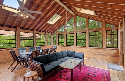 The open floor plan includes a spacious living area with a smart TV and a fireplace ideal for chilly evenings. Just off the living room is a massive screen porch with a large smart TV, comfy couches and a harvest table for comfortable dining. Step outside to access the gas grill. The main level also includes a beautiful kitchen stocked with pots and pans, cooking and dining utensils, dishware and glassware. a sunny breakfast area overlooks the front yard. The primary suite offers a king-size bed and adjacent full bath.