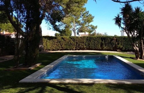 A large detached villa with ground and first floor. It is built on a 1086 m2 plot with a garden with lawn, trees and palm trees, a 8 x 4 swimmingpool and barbecue. It is 200 m from the beach. The ground floor consists of a living room with fireplace wich opens onto a terrace with views of the garden and swimmingpool, a fully furnished kitchen, and has a laundry room wich opens to outside shower and washing line, 1 full bathroom and 1 double bedroom. It has an inside stair case and the first floor consist of 1 double bedroom with balcony, 1 double bedroom with a bathroom and balcony, 1 bedroom with 1 bunk and 2 singles beds, and 1 full bathroom. The capacity of the garage is for 2 cars. Internet conexion by USB. Perfect villa for families, parties not permitted. DESCRIPTION OF THE AREA The Costa Dorada is the most laureated in Catalonia with 37 blue flag beaches, known for their quality and excellent state of conservation. They are beaches and small dreamy coves with turquoise and crystalline waters, most of them without crowds and some of them untouched. A perfect scenario to walk on the GR-92 route, take a bike, boat or kayak trip, or go scuba diving and discover the secrets that lie at the bottom of the Gulf of Sant Jordi. On the Costa Dorada, there is the Calafat sea front, where we find the urbanization, racing circuit and marina of the same name. The quiet and high standing urbanization of Calafat , with more than 2 km of coastline, is located in the municipality of the fishing village of L'Ametlla de Mar, known for the high quality of its fish. 20 minutes to the south you will find the Delta del Ebro Natural Park and you can try one of the restaurants where the best rice in the country is cooked. You can dive with the largest tuna in the world and enjoy exciting moments, sailing on a modern and innovative catamaran. PorAventura World is a unique holiday destination full of fun for the whole family, just 30 minutes from Calafat.