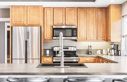 Fully appointed kitchen with appliances, including stove, oven, refrigerator, dishwasher, and microwave. Bedrooms are comfortably furnished with fresh crisp new linens, pillows, and bed coverings. Master bedroom features a private en suite bathroom and Smart TV.