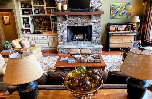 ● The main level includes the master bedroom with a king bed, steam shower, jacuzzi tub, double vanity sinks, wood-burning fireplace, and private screened porch.