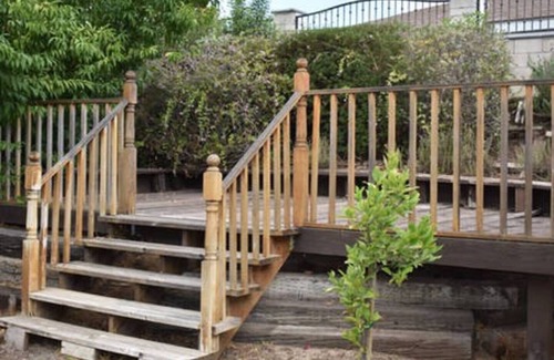 A spacy backyard with flowers and fruits . Listening to the bird singing and taking the fresh air.