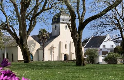 Petite maison de 40 m² mitoyenne pour 2 personnes située dans le hameau de Kergolay sur la commune de Locmaria à 200 mètres du sentier côtier, à 500 mètres de la plage de port blanc et 1 km des commerces de locmaria et comprenant :
