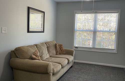 Spacious house in the back of a quiet and family friendly cul-de-sac. 1 king and 2 queen sized beds, a full size air mattress, and a crib for any little ones you bring along. The fully fenced in and private backyard has a patio table, inviting firepit with 6 wood adirondack chairs around it, and beautiful views of the forest behind it. Bring the whole family to this great place with lots of room for fun. Enjoy cooking your own meals in our fully functioning kitchen.