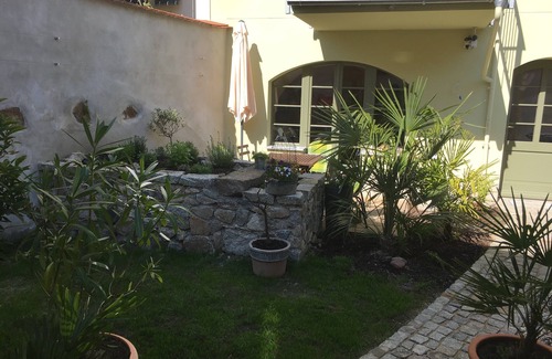 This apartment on the 2nd Located on the upper floor of the house, it appeals to lovers of classicism and has a modern kitchen. For a good night's sleep, we have equipped all apartments with box spring beds. It also offers guests an enchanting view over the green courtyard onto the roofs of the old town of Görlitz. The apartment has a balcony and of course the garden with terrace and the sauna can also be used. A breakfast can be booked as needed in our Nikolai Cafe (approx. 15m away).