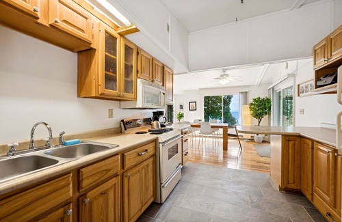 Step inside to discover an inviting interior with luminous hardwood floors, new seating in the living room that encourages relaxation, and large lake‑view windows framing tranquil waters. The dining area has been elegantly updated with a modern table and chairs bathed in natural light, ideal for gatherings or a cozy meal. Ceiling fans help maintain comfort throughout the airy open-concept layout.