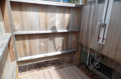 Large outdoor cedar shower with hot & cold for washing off after a day at the beach.