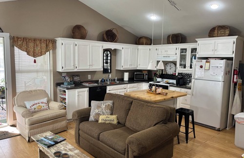 Rachel's place is located in Signal Mountain, TN. The cottage has a complete kitchen, bedroom with a queen bed, a murphy bed (full), bathroom w/shower and washer and dryer, a sun room in which you can have a cup of coffee as you look out into the fenced in back yard that has a garden and bird feeders. The back yard also has a fire pit with plenty of fire wood. It has a private parking area that is easy to enter and close to the front door.