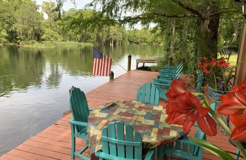 Rainbow Springs Serenity Vacation Home is a unique, four person, fully furnished, true riverfront property with the water running right under the house. With canoe, kayak and paddle board access and large private boat dock. Unfortunately due to insurance constraints we cannot offer the boat or slide. This property is located on the beautiful Rainbow Springs and nestled just outside the historic City of Dunnellon. It's less than 5 minutes from a public boat ramp, boat rentals, local restaurants, a state park, bike/walking trails and more. Enjoy the stunning river views from almost every room! This tranquil find is ideal for those looking for a family friendly home away from home.