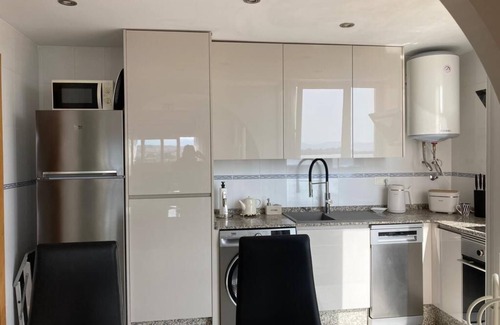 This apartment has been tastefully furnished, and has wonderful views over the bay to the town of Puerto de Mazarrón. The entrance leads directly into a small hallway, with access to the separate kitchen area. This has cooker, fridge, microwave, washing machine and all the items needed for a self catering holiday. A feature arch forms a breakfast bar, giving the apartment a spacious feel.