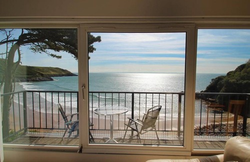 Outside : balcony with views of Caswell Beach finished with outdoor chairs and table.