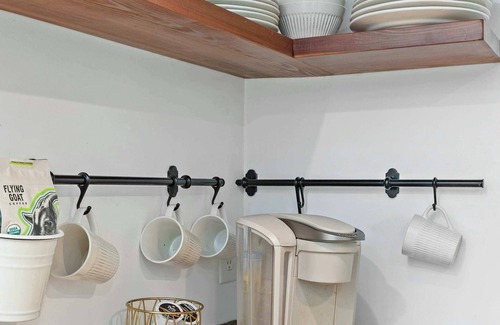 Tastefully decorated with a modern boho aesthetic, this 1-bedroom, 2-bathroom home is designed for relaxation and comfort. The main level is bright and open, with an inviting living room that features plenty of seating, a TV for movie nights, and a clever queen-sized Murphy bed that easily folds down for extra guests.