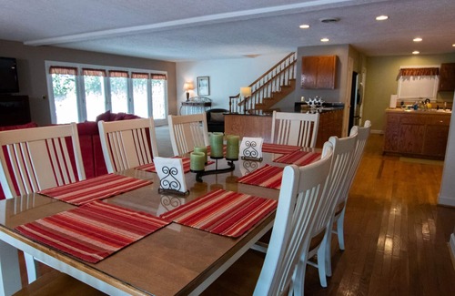 Spacious and private 5,000 sq.ft. house with four large bedrooms - sleeps maximum of 13 (king with trundled day bed, king with sleeper chair, queen with trundled day bed, twin beds). Great room with dining, all glass sunporch with seating, dining, games. Deck, porches, balcony & many windows offer great views. Fully equipped modern kitchen, refrigerator with ice maker, dishwasher, microwave, washer & dryer. TV with Blue-Ray, boom box with CD, foosball table, bumper pool/game table. Outdoor gas grill & 2 picnic tables. Linens are proved. Private & easy access to the river with flat grassy area. No pets. No smoking.