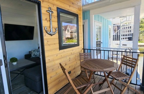 This 2nd edition of the luxurious tiny floating cottage (TFC) has everything vacationers will need to relax in style on the water in South Haven Michigan. The Shoreside Haven can sleep up to six persons and has a master bedroom with a queen-size bed. There is also a bunk room with a twin-size bed over a Full size. The open concept living room has full size fold-out sleeper sofa. Fullyequipped Bathroom with stand up shower. The Living room has a patio door that leads to the lower level deck.