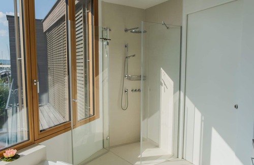 Residence "Am Pier", built in 2021. 22 houses in the residence. On the outskirts, 2 km from the centre of Neusiedl am See, excellent location: right in the centre but still quiet, on the lake, direct access to the lagoon. For shared use: lawn for sunbathing. Private: outdoor shower, terrace, garden furniture. In the house: sauna (all included), infrared sauna, storage room for bicycles, sun terrace, central heating system, air conditioning, washing machine, tumble dryer. Bread roll service. Roofed, parking at the house, single garage. E-charging station. Supermarket 1.5 km, restaurant, café 50 m, bicycle rental 1.5 km, 20 minute walk to the centre, bus stop "Mole West" 50 m, lake Neusiedlersee. Sports harbour 50 m, marina 50 m, golf course (9 hole) 4 km, surf school, sailing school, tennis 2 km, indoor tennis centre 2 km, minigolf 2 km, cycle lane 20 m. Nearby attractions: Parndorf Outlet 7 km, St. Martins Therme 24 km. Well-known lakes can easily be reached: Neusiedlersee. Please note: not suitable for small children. Loading and unloading of baggage is possible at the holiday house. 24hr guard. The apartment is located in a zone with limited traffic. Neighbourhood highly sensitive to noise. Quietness and good behaviour expected. Direct access to the lake with entry from the private sun terrace. 2 stand up boards are available. Awnings for shade. Air-conditioned cooling ceiling in the house which automatically cools or warms the room temperature as required.