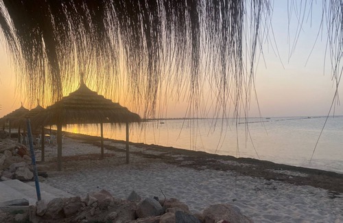 In the paradise kerkennah islands, at 18 km from the continent. 2 flats able to hold easily 4 persons each located in 7 meters by the sea, and a barbecue zone under a magnificent Hawai tent .
