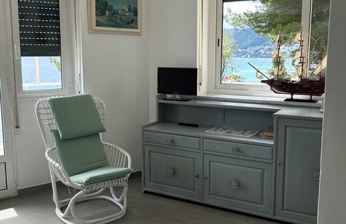 Large terrace overlooking the sea, 2 bedrooms, 2 bathrooms, living room with kitchenette, oven, dishwasher, washing machine, air conditioning. The master bedroom has a sea view, the other bedroom has 2 single beds, but can also become a double, has a view of the green forest and the sea. The living room has large windows to the panorama