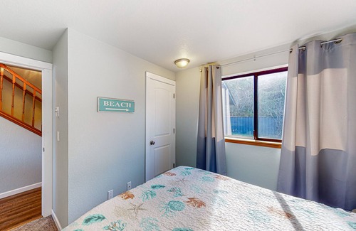 Return back to your humble house and walk in through the front door to find a wide living area with comforting furnishings, a dining room table, and a wood stove. All along the walls of the house hang encouraging and welcoming signs, sure to make you feel right at home. You'll have plenty of counter space in the full kitchen, equipped with sleek appliances for cooking up a delicious meal for you and your guests. This bountiful blue home boasts an outside patio area where you can watch the stunning view of the cascades. Light the firepit and roast some marshmallows, or end the night with some good old-fashioned American cuisine and throw some patties on the grill. Head back inside and get a much-deserved good night's rest.