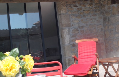 An iron staircase gives access to the gangway with relaxation area (90cm bed) and to the 40 m2 private terrace without any opposite and a breathtaking view of the surrounding valleys. From there you can see the 3 valleys and the Tanargue mountains. The exterior is equipped with a table, lounge chair, electric barbecue, and an old stone sink.
