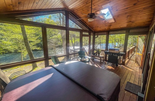 If you are looking for a serene and relaxing getaway look no further. Imagine waking up in the giant master suite with the sliding door open listening to the rolling water of the Toccoa River. The river runs only 20 feet from the lodge so there is a constant sound of running water; what a wonderful sound. The back porch is screened in so no need to worry about bugs. If you are a fly fisherman, just grab your gear and walk directly into the running water; no need to drive anywhere. The lodge sleeps 6 so there is plenty of room for friends and family. Come make long lasting memories at the River Run Lodge.