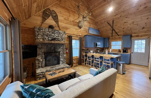 Features 3 bedrooms and 2 baths. Boasting some of best mountain views of the property, is walking distance to the tennis courts, Deer Run Chalet, the children’s playground and a separate game room. The main level features an open plan with kitchen, dining, living room, full bath and bedroom. The kitchen has new appliances and is perfect for shared meals at the large dining table; the living room has a relaxing sofa and large TV. The wood-burning fireplace in the living room beckons time together, and the wrap-around deck with outdoor seating is perfect for grilling and appreciation of the beautiful landscape. An outside fire pit area adds loads of fun to nighttime gatherings of family and friends. The main level includes a queen bedroom with bathroom; two bedrooms upstairs provide one king bedroom, and the other has 2 bunk beds with a shared luxury bathroom. There's a queen sofa bed in the living room. Eagle’s Nest features the largest detached entertainment space with TV, plenty of plush seating, PS5, pool table, foosball, board games, and luxurious lounging areas. Parking for up to 5 or 6 cars.