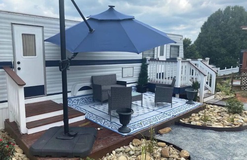 Robins Nest is a one bedroom camper setup permanently on a private lot. It has a beautiful deck that is great to enjoy the evenings as well as a large elevated patio with gazebo that affords beautiful sunset views and is a great place to cook out on the flat grill and enjoy company.