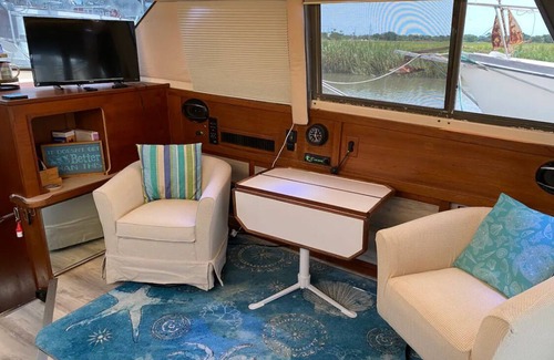Tybee Island Waterfront Getaway is located at the Tybee Island Marina. You’ll stay aboard Four Reels, a 36 Foot Motor Yacht, just 3.5 miles away from Tybee’s beaches, and a short drive to Savannah’s historic district. Included in your stay is ocean, beachfront access at our home. This includes free parking, beach chairs and cart, towels and a cooler. From the aft patio of the boat you’ll enjoy breathtaking scenery, to include a nests and dolphins. Enjoy a culinary feast just steps away at Bubba Gumbo’s, voted #1 Seafood in Savannah 5 years running.