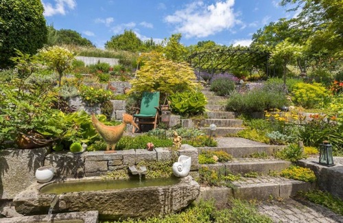 Situated in a quiet south-facing location, the house was originally designed as a modern guesthouse and has since been run as a family business. Through continuous modernization and improvement, your needs as guests are always taken into account. The view over the village and into neighboring Switzerland, sometimes even as far as the Alps, the peaceful atmosphere, the Mediterranean-style garden, and the ambiance of the house all contribute to a relaxing stay. Walking distances: town center and bus about 10 minutes, clinics about 10 minutes, youth center about 20 minutes, to Diessenhofen (Switzerland), train station, and Rhine harbor about 25 minutes. By car: Konstanz about 45 minutes, Schaffhausen-Rhine Falls about 20 minutes, Zurich Airport about 45 minutes. Parking for cars is available at the house and nearby.