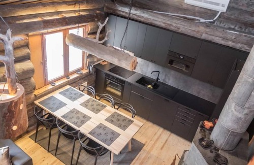 From Kuusamo to north 27 km, Ruka Village (West Ruka) 2.5 km. 1986 built kelo log cabin in row house, bedroom 1: double bed, bedroom 2: 2 bunk bed (Attention! Another bunk bed is 180 cm length!), loft: 4 matresses. Combined kitchen + living room. Electric sauna, 2 showers.