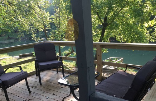 A rustic, open-concept studio cabin located on the banks of the Southfork River in historical Hardy, AR. A great spot for swimming, canoeing, kayaking, fishing or just relaxing on the deck. This cozy cabin can sleep 4 adults comfortably or 2 adults and 3 children. There is a queen size bed behind a partition as well as a futon, couch and single bed in the living area. Other areas include a fully equipped kitchen and a full bath.