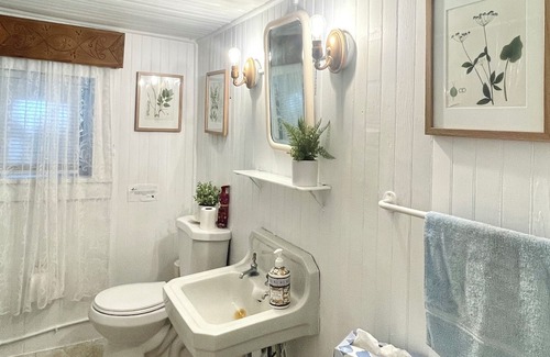 Our property is perfect if you seek peace and tranquility. You can fall asleep to the sound of the creek and the breeze moving through the trees. Homestead Cottage is very simple—no frills; a place to connect with nature and one another. There is a large stone fire pit with overhead lights to enjoy. Take a chair and relax beside the creek. We have a king-sized bed in the bedroom overlooking the creek, with a window air conditioner. The bedroom has a very small attached half bathroom, and there is a full bathroom as well. The kitchen has a refrigerator/freezer, coffee pot, Keurig, toaster, and microwave. There is also a propane BBQ/gas grill for you to use. The ceiling height in the kitchen/first floor is low. This is one of the cottages on the property; there are others as well that are lived in full-time. There are sometimes turkeys, chickens, and always a dog or two about, as well as two cats.