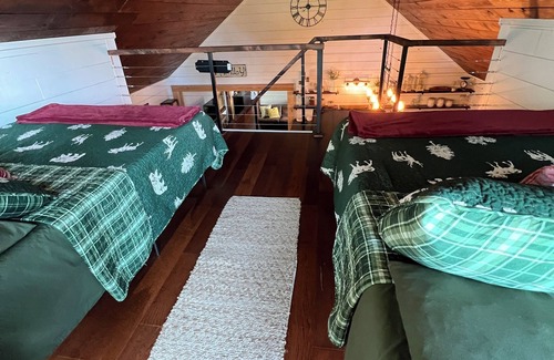 The cabin boasts a spacious loft, perfect for accommodating four guests, while a cozy guest room with a queen bed provides additional sleeping quarters. The primary suite is a haven of luxury, featuring an en-suite bathroom and a large walk-in closet for added convenience.