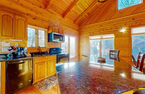 When you enter this lakefront abode, you will discover a beautifully decorated open floor plan with rustic touches, cathedral ceilings, exposed wood beams, and plenty of windows filling the space with natural light. Curl up on your favorite sofa and watch a fun show or movie on the TV with streaming service available . Surprise your loved ones with your cooking skills and prepare delicious homemade meals in the well-equipped kitchen. Outside, you will find a sunny deck with numerous seating options where you can lounge and create everlasting memories with a backdrop like no other. Sleeping arrangements include a private bedroom on the main floor and a loft area upstairs with a bed.