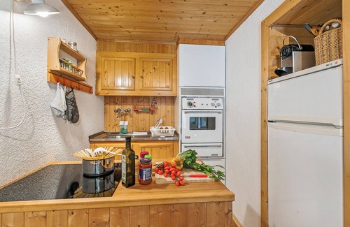 Tucked away on a quiet pedestrian street, this pretty house sleeps 4 people. The living room has cool terracotta tiled floors and wooden paneled ceilings. It is furnished with cane armchairs and a wooden cabinet. Around the corner is an open-plan kitchen and dining area, with a cosy, wood-burning stove and a table for 4. The kitchen is well-equipped with a cooker hob, oven, fridge-freezer, toaster, fondue set and a Nespresso machine.