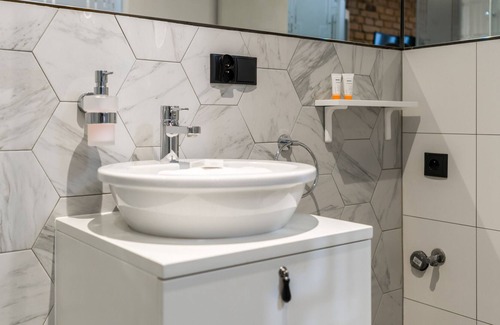 The stylish studio apartment on level -1 of the tenement house is a great choice for a single traveller. The 20 m² space is divided into a living room with a single bed, a kitchenette, and bathroom with shower cabin. The interior wonderfully conveys the historic atmosphere of Poznan's Old Town thanks to the preservation of the raw brick walls. At the same time, grey and white details add an urban and modern twist to the decor. Additionally, a wide range of amenities cater to all needs during a stay. Multimedia include free access to a Wi-Fi network, and a flat-screen TV with cable channels. Kitchen and bathroom essentials, such a hair dryer, ironing facilities, and induction cooktop, increase the independence of our guests. For a stress-free beginning of every stay, complimentary cosmetics set, towels, and bed linen are provided.