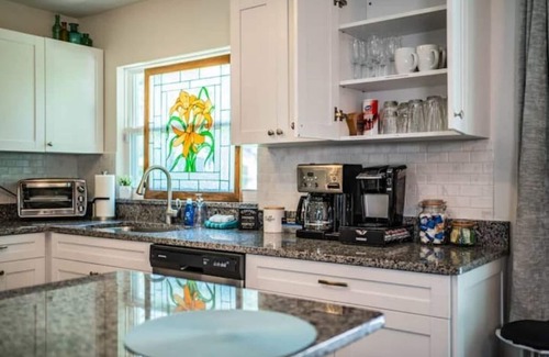 Our kitchen is well equipped with a coffee maker, single cup Keurig machine, oven, toaster oven, and a dishwasher. You will find all the utensils, plates, bowls, glasses, and cookware needed to prepare meals. Additionally, we have prepared a delightful selection of light refreshments for you to enjoy during your stay.