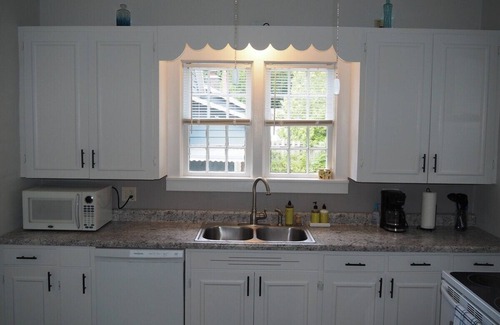 The home has been recently remodeled and is attractively designed with a nautical / beachy theme throughout the house. The home has a fully-enclosed front porch for hanging out and relaxing. The kitchen has all appliances, including a dishwasher. The home has a very convenient main floor washer and dryer. It has window A/C units to keep things cool in summer. The home also has high-speed Wi-Fi and live streaming television including Hulu, Pure Flix, Fox Nation, Disney +, and Netflix.