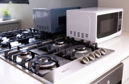 Open Plan Kitchen with stone bench. The kitchen is fully contained of cooking accessories and utensils. Gas cooktop, electrical oven and microwave.