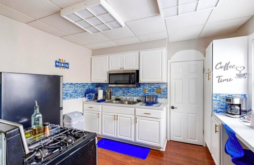 This cozy retreat boasts modern charm with royal blue vibrant accents, a comfortable living area, and high-quality bedding for a restful stay.