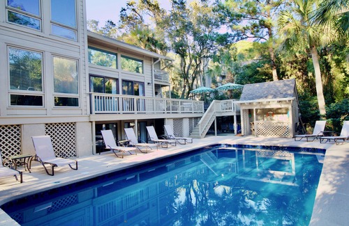 Enjoy this terrific beach house in a great location, only a quick 2 minute walk to the beach. Grab your coffee cup and sit on the beach to watch the sunrise or bring your bottle of wine to enjoy the cool evening breezes! Come enjoy the large spacious floor plan, perfect for your group to have a great beach vacation. This 5 bedroom, 4 1/2 bath house comfortably sleeps 13 guests with a large deck overlooking a 15'X30' pool (heat additional ). Fenced in yard. Large kitchen with plenty of seating for everyone. Light and Airy Family Room with cozy couches, large tv, PS3, DVD, 500MB Superfast Wifi , Roku and Hulu live streaming. Borrow a Boogie Board, Beach Chair or Game to enjoy time on the beach while relaxing at night with a board game or family movie. Walk out the back gate to the beach path and relax on the stunningly beautiful, quiet beach. Enjoy all of Sea Pines many amenities including Golf, Tennis, Boating, Fishing, Nature Preserve, Stables, and over 15 miles of Bike Trails. There are lots of great restaurants close by as well as plenty of excursions for the adventurous type. This is the place where you can choose to be active or just relax, it's all your choice.