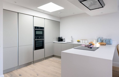 Kitchen with double electric oven, induction hob, fridge freezer, dishwasher, wine fridge, microwave and Phillips L'Or Barista coffee machine.