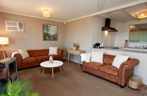You will feel at home immediately. There is a living/lounge area with a wall mounted Air Conditioner. There is also an open style kitchen between the lounge and meals area. The main toilet is found between the entrance and the laundry. There are 2 bedrooms upstairs with queen size beds.